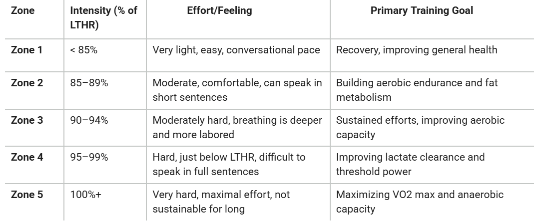 Once you know your LTHR, you can tailor your training intensity more effectively.Training Zones Based on LTHR